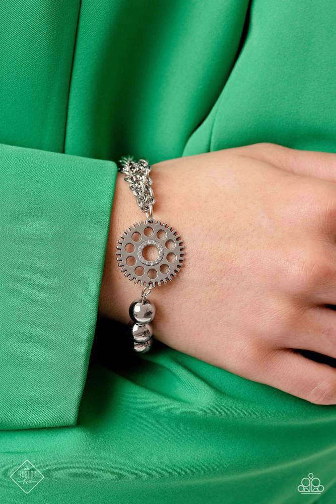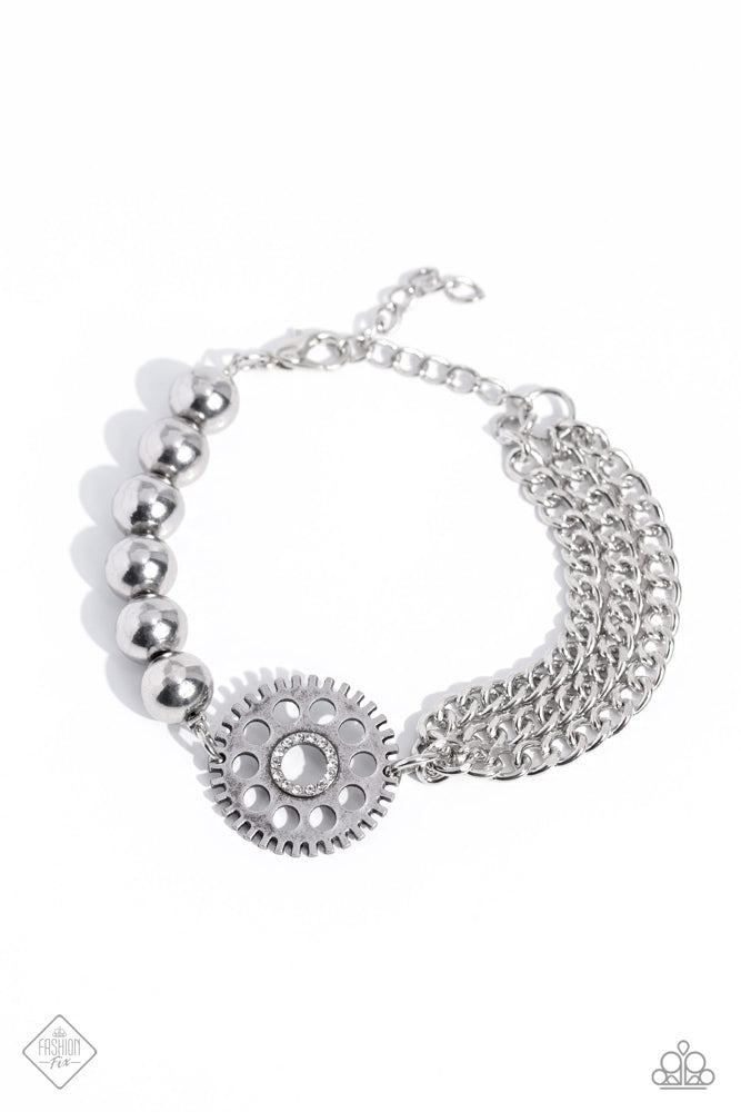 A trio of thick silver chains and a row of silver metallic beads frames a gear pendant with a center of white rhinestones for a glitzy, steampunk-styled centerpiece atop the wrist. Features an adjustable clasp closure.