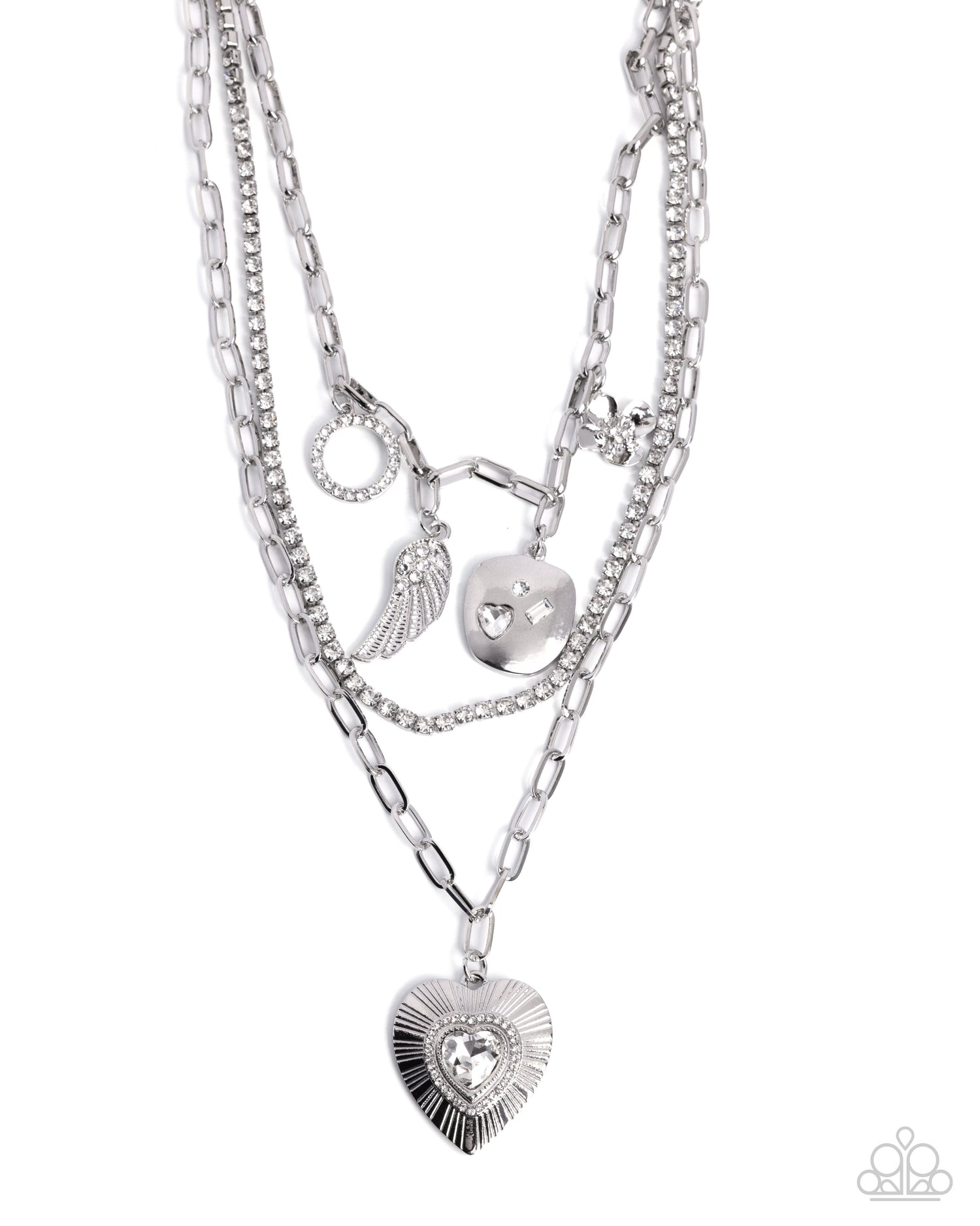 A trio of layered silver chains featuring unique textures, including sleek links and a strand of white rhinestones, creates a statement around the neck. Dangling charms, such as a white rhinestone encrusted ring, an angel wing with white rhinestones on its upper half, a smooth silver disc with white gems pressed in its front, and a dainty silver floral charm, add an element of playful sophistication. A stripe-textured heart dangles from the lowermost chain, with a brilliant white heart gem in its center with dainty white rhinestones around its border. Features an adjustable clasp closure.