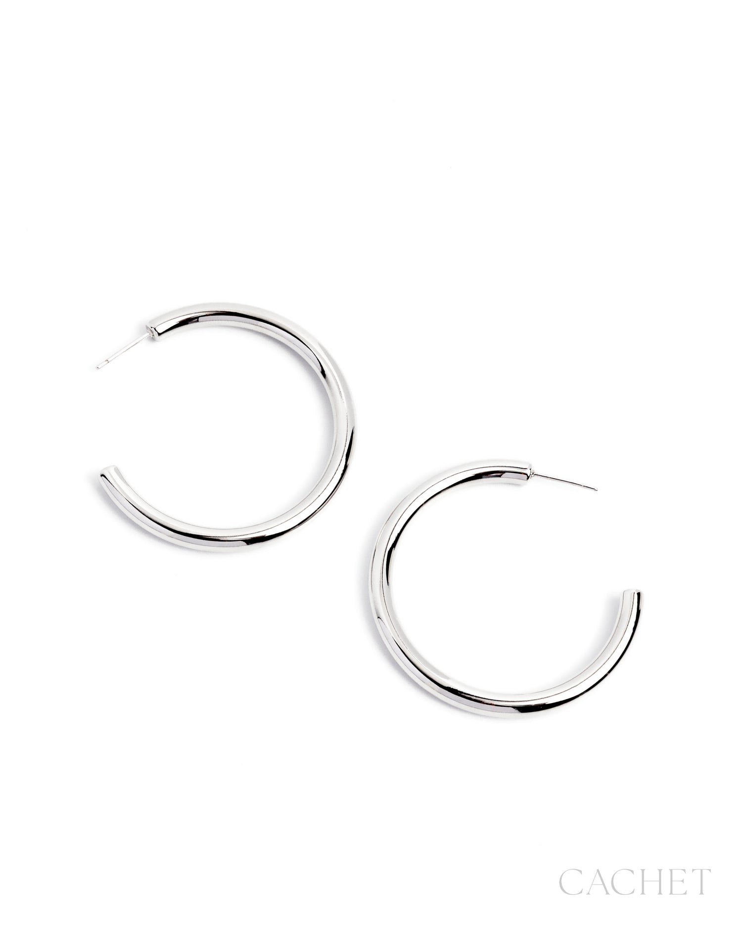Premium Stainless Steel Base and Rhodium Plating. Earring attaches to a post fitting. Includes a butterfly back and a silicone back with a Rhodium Plated ring around its center for a snug fit. Hoop measures approximately 1 3/4" in diameter.