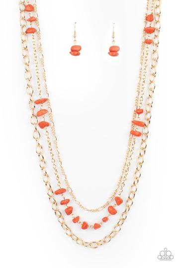 Infused with sections of refreshing orange stones, a trio of mismatched gold chains layer down the chest for a dash of earthy refinement. Features an adjustable clasp closure.