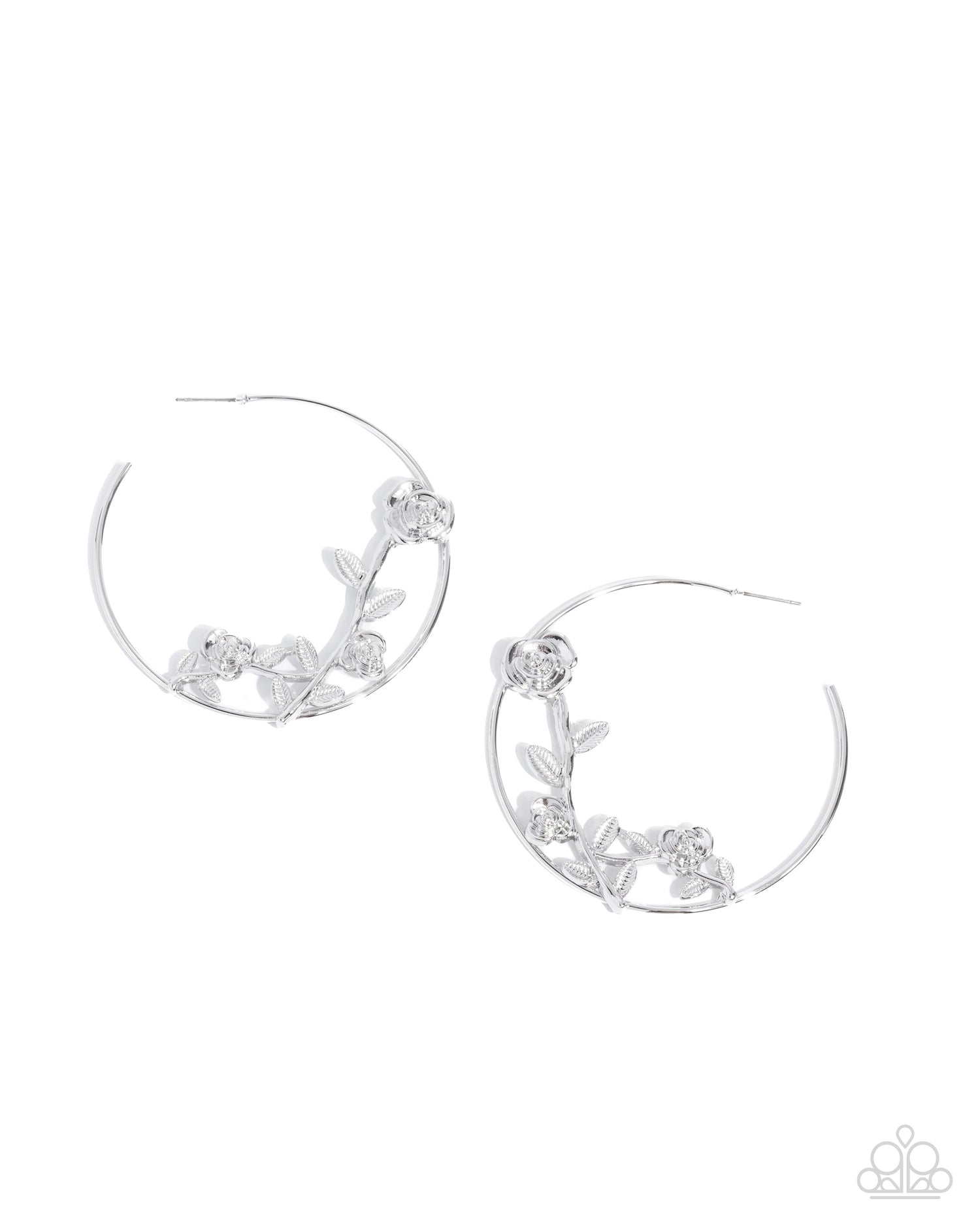 Featuring subtle texture, a silver rose stem featuring various roses and leaves blooms along the inner circumference of a thin silver hoop for a simply stunning whimsical display. Earring attaches to a standard post fitting. Hoop measures approximately 2 1/4" in diameter.