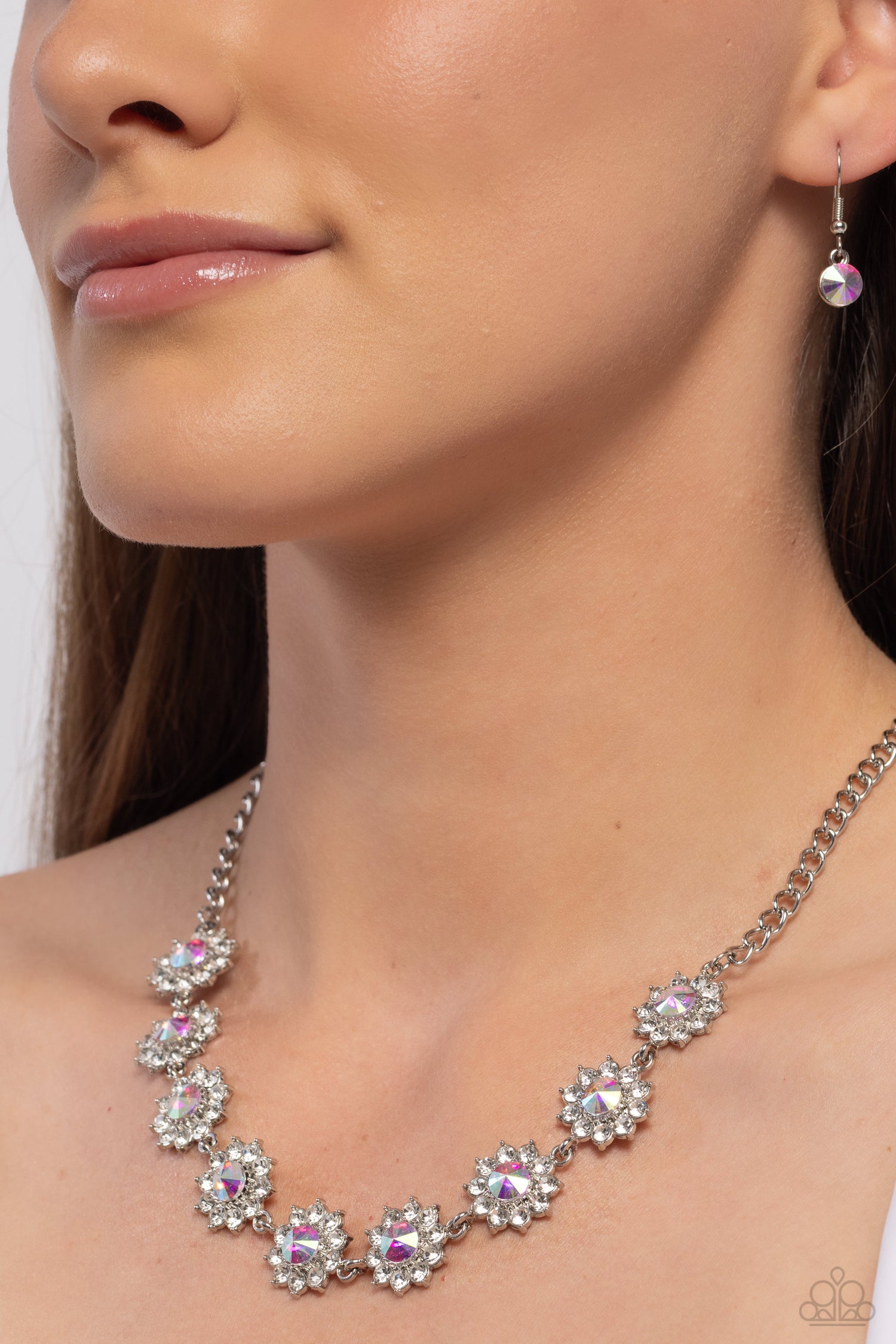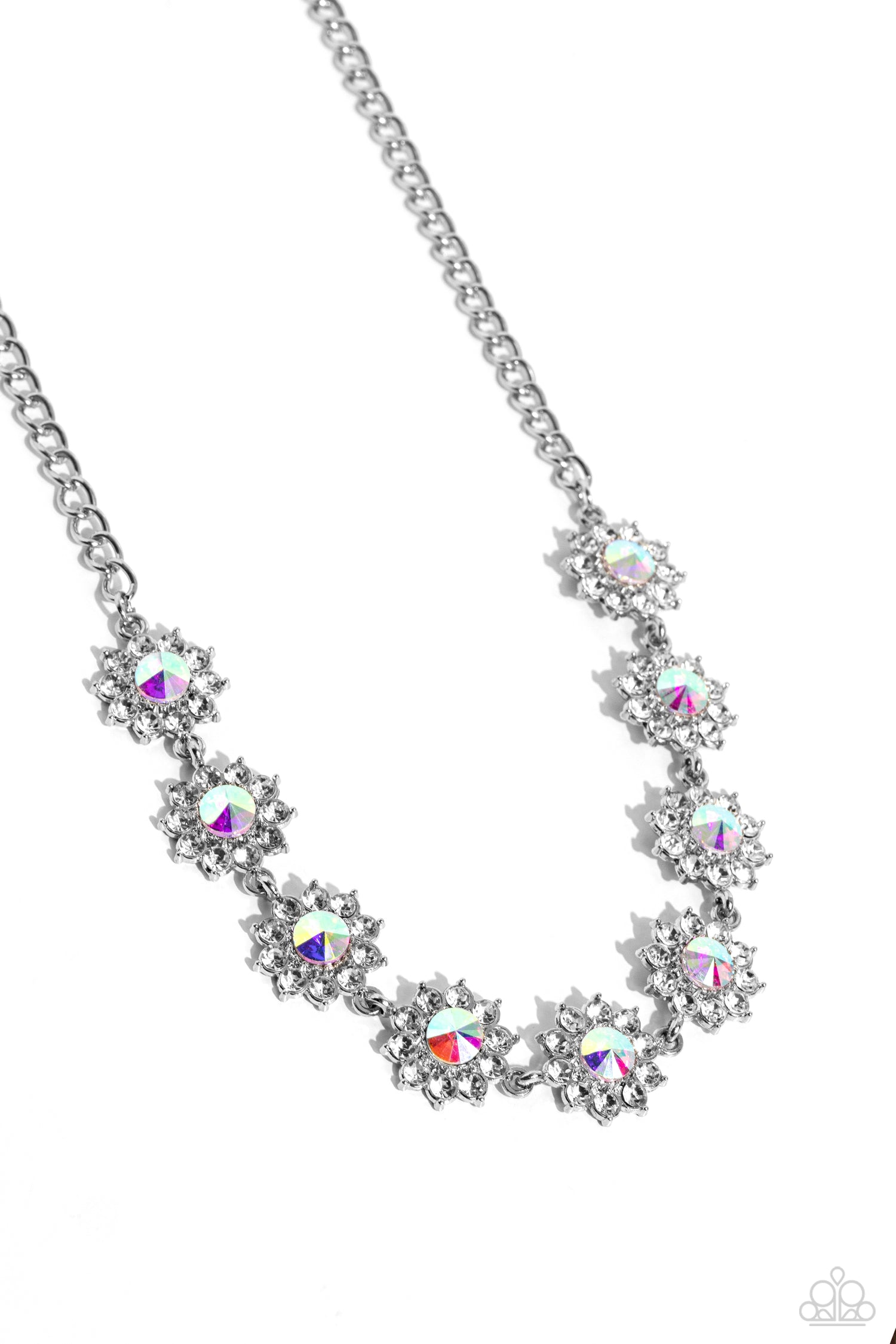 Shiny white rhinestone petals bloom from a shimmery iridescent center, creating a whimsical floral arrangement below the collar. Due to its prismatic palette, color may vary. Features an adjustable clasp closure.