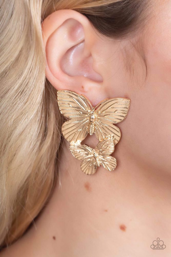Veined with lifelike textures, a pair of golden butterflies flutters from the ear for a whimsical fashion. Earring attaches to a standard post fitting.