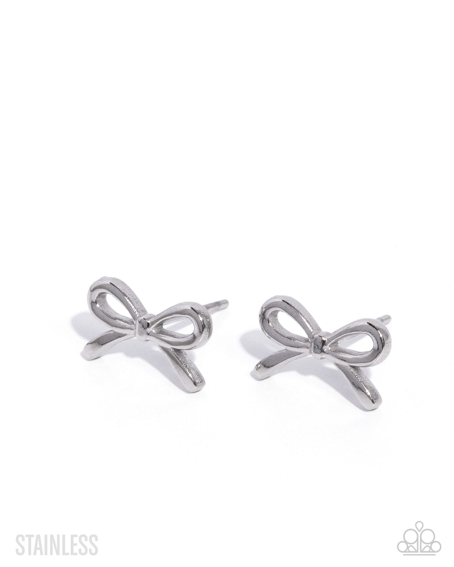Featuring stainless steel, dainty silver bows glisten from the ear for a classic coquette-inspired display. Earring attaches to a standard post fitting.