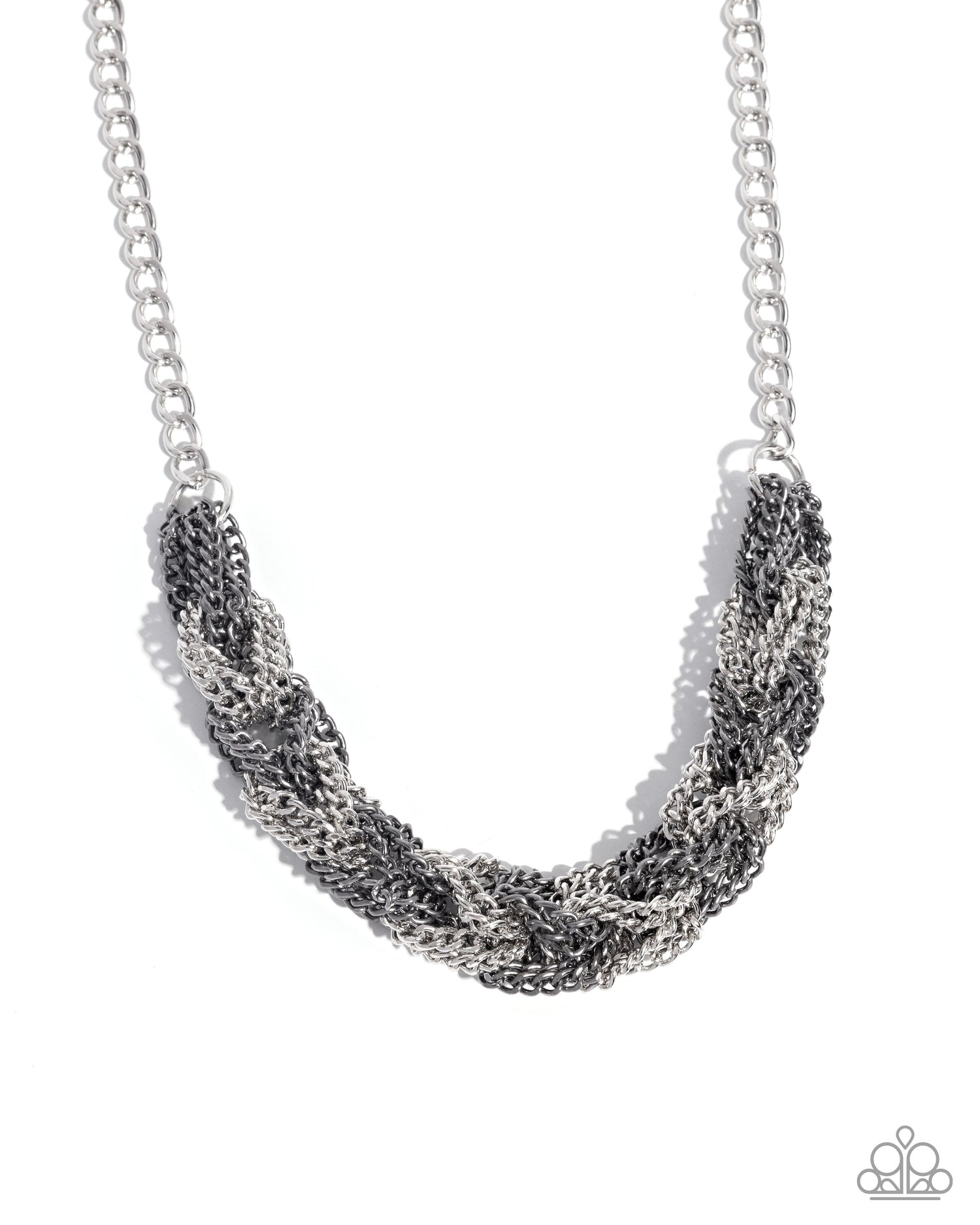 Strands of glistening skinny gunmetal and silver curb chains create an alternating, industrial braid below the collar from a thick singular silver curb chain for a chic contrasting look. Features an adjustable clasp closure.