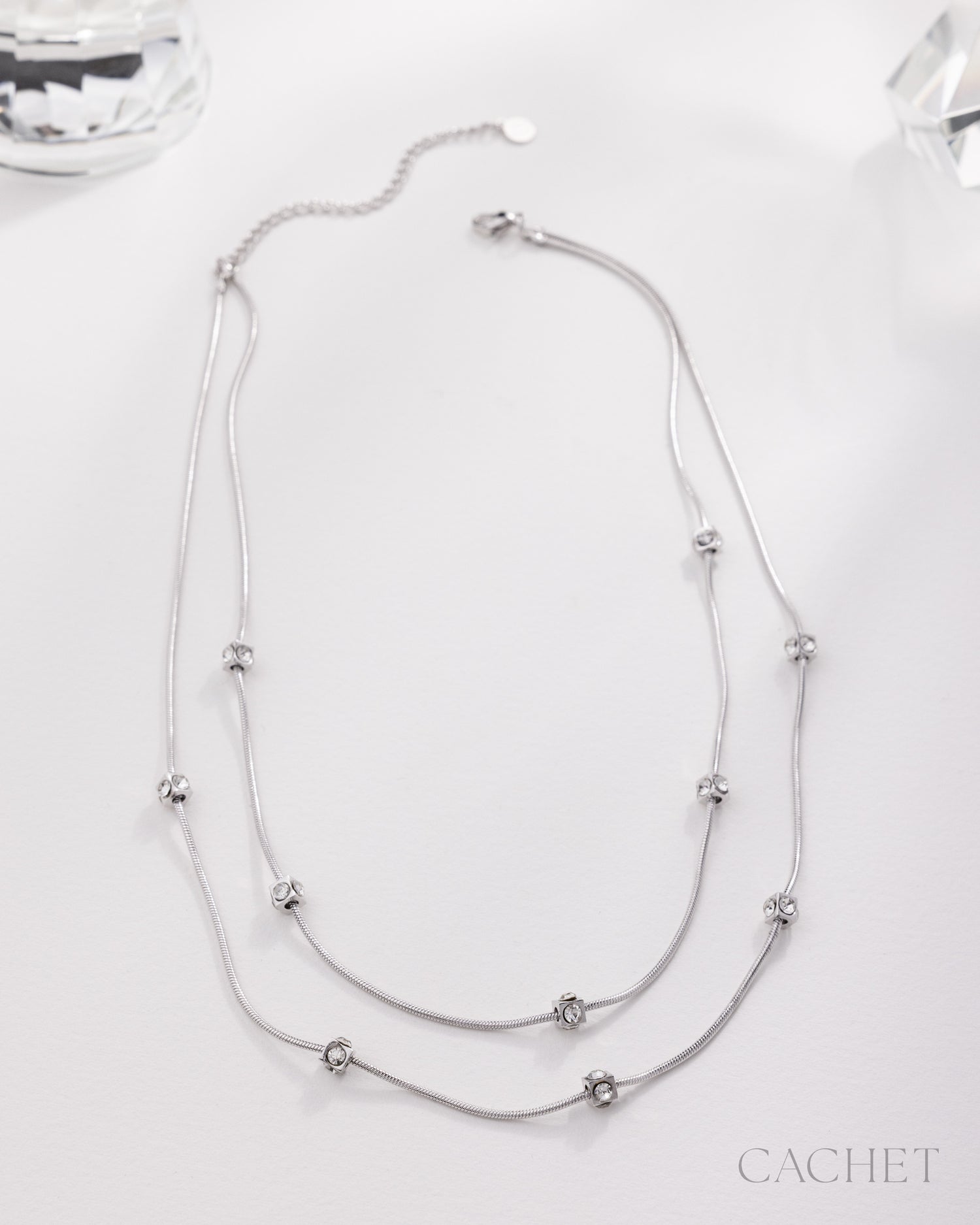 Crafted with intention, the necklace "Choisi" drapes the neckline in a tiered sweep of sleek snake strands punctuated by silver cubes featuring dainty elevated rhinestones, creating an effortless expression of curated elegance.