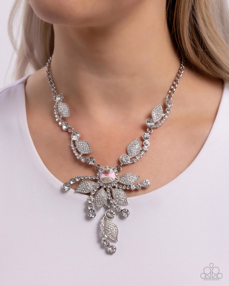 An oversized iridescent rhinestone sits at the center of glittering silver petals, creating a brilliant floral-inspired pendant. Dainty rhinestones and textured silver leaves line the silver chain, adding extra sparkle to the design. Features an adjustable clasp closure.