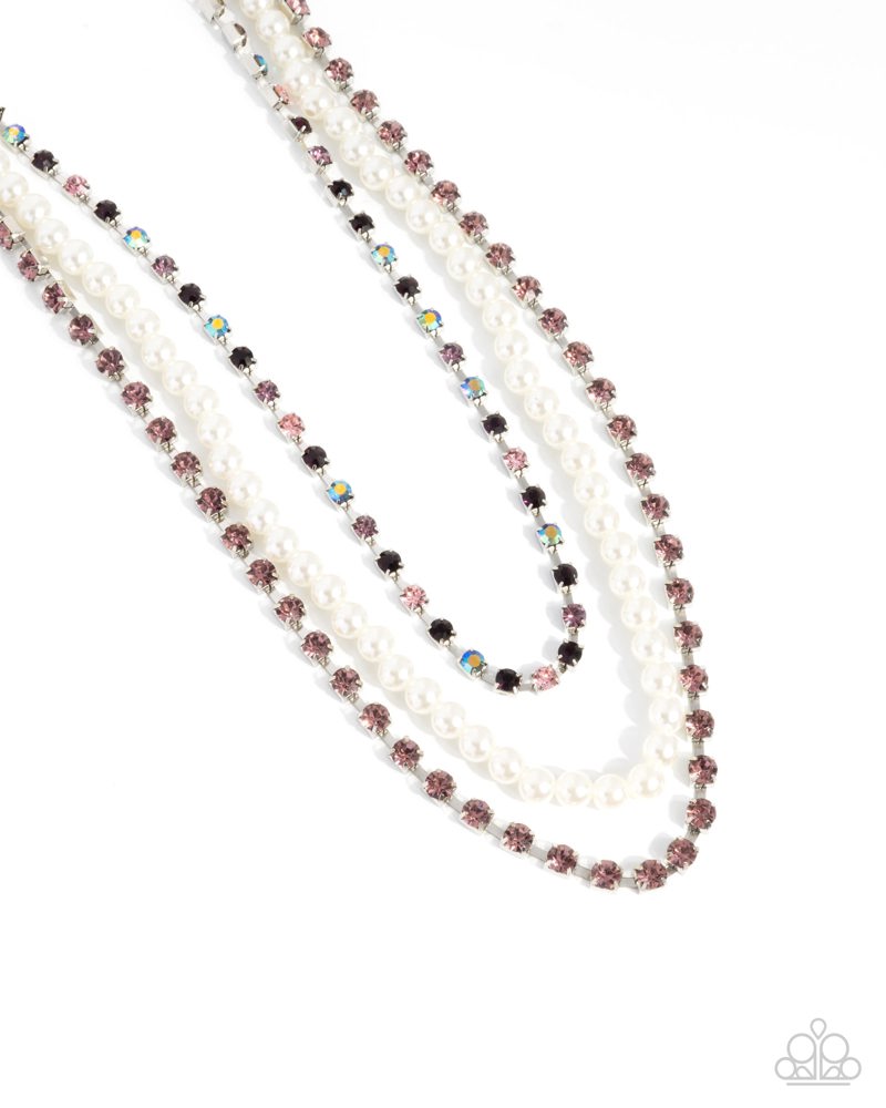 Pressed in pronged silver square fittings, amethyst rhinestones join a strand of glossy white pearls, and an additional silver square-pronged strand featuring light amethyst, violet, light rose, and violet iridescent rhinestones for a shimmery layered look. Features an adjustable clasp closure. Due to its prismatic palette, color may vary.