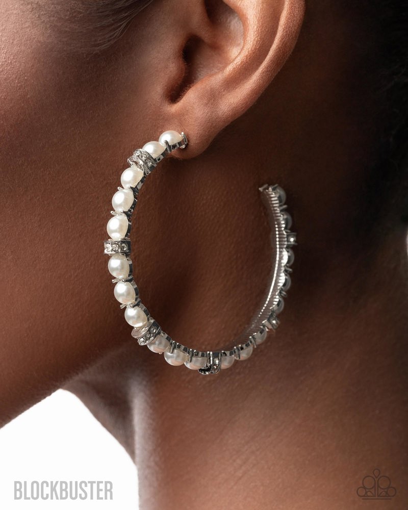 Pronged in elevated silver fittings, lustrous white half-pearls curl around the ear, creating a timeless lure. Airy silver sections, adorned in sparkling white rhinestones, are effortlessly sprinkled among the sea of pearls, infusing the design with capricious shimmer. Earring attaches to a standard post fitting. Hoop measures approximately 2 1/4" in diameter.
