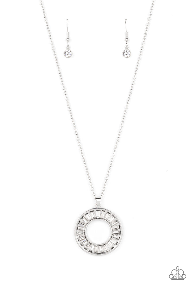 Brilliant white emerald cut rhinestones are pressed inside a wide circular silver frame creating a glitzy pendant at the bottom of a dainty silver chain. Features an adjustable clasp closure.