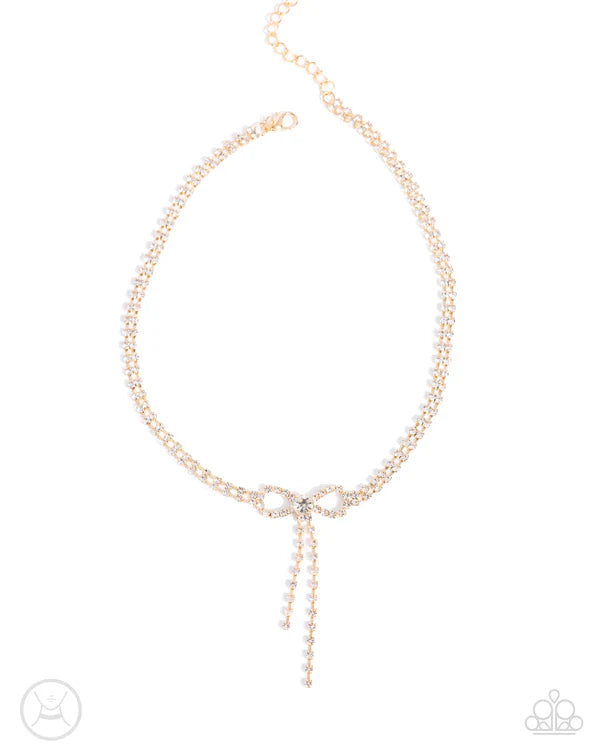 A double-stranded display of glistening white rhinestones in gold square fittings cascades around the collar to a white rhinestone and gem-embellished bow that loops and curls below the collar for a regal display. Features an adjustable clasp closure.