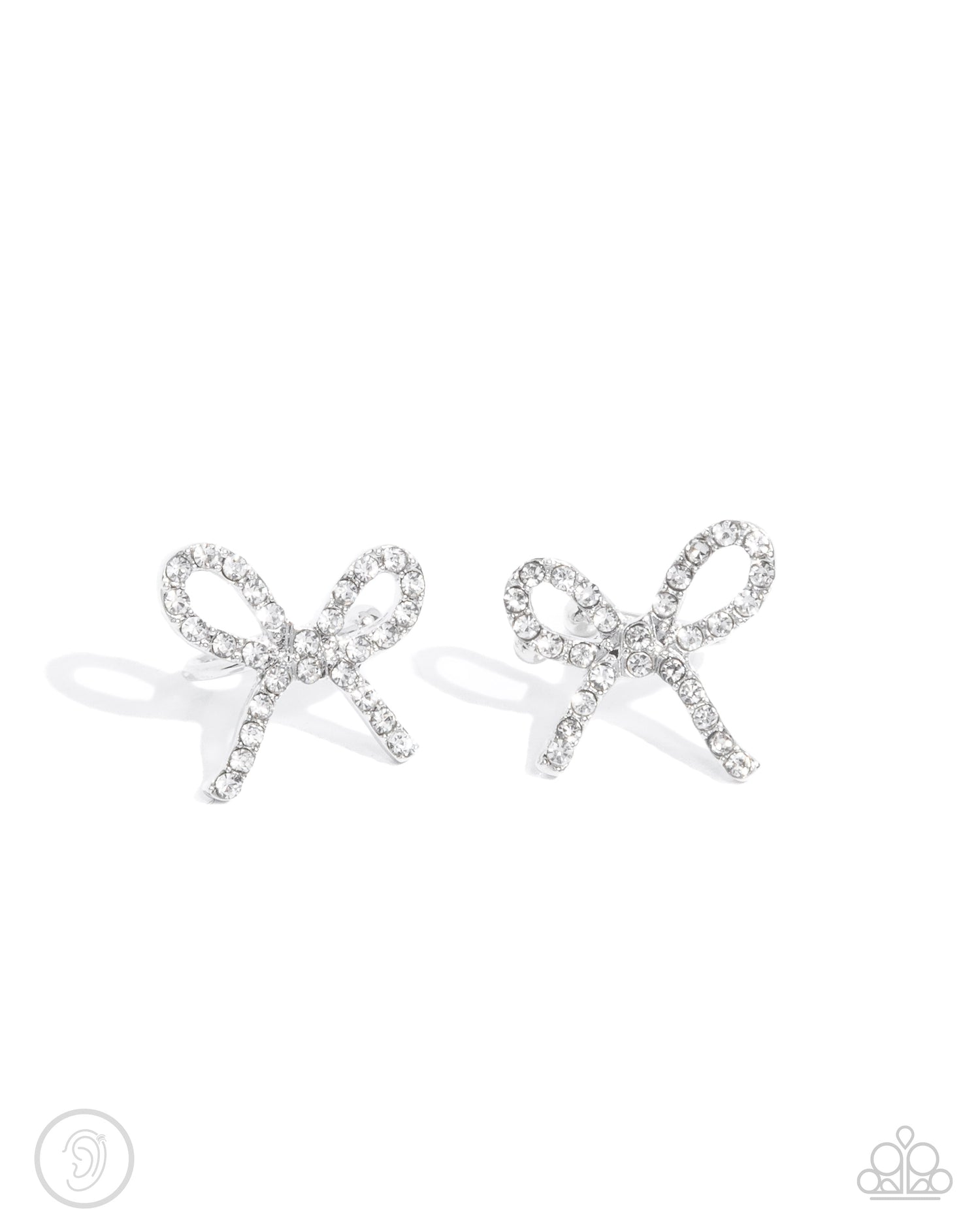 Embellished in glistening white rhinestones, a loopy curly bow of silver is embellished along an adjustable, one-size-fits-all silver cuff for a refined look. Dainty silver balls are affixed to the ends of the hoop, reminiscent of a barbell fitting for a glistening finish.