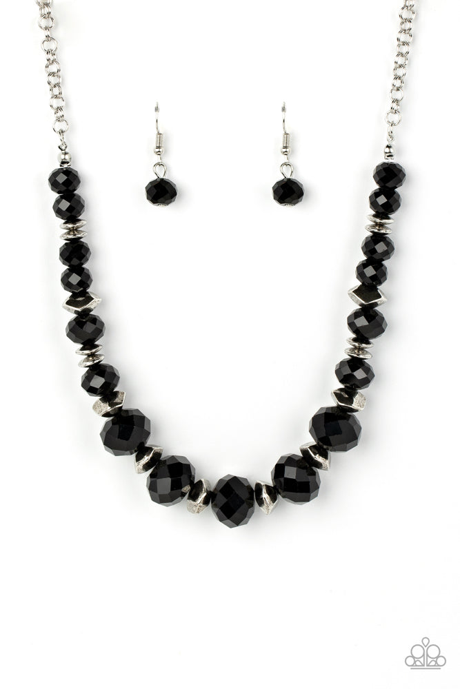 Separated by silver discs and faceted silver accents, faceted black crystal-like gems are threaded along an invisible wire below the collar for a stellar statement. Features an adjustable clasp closure.