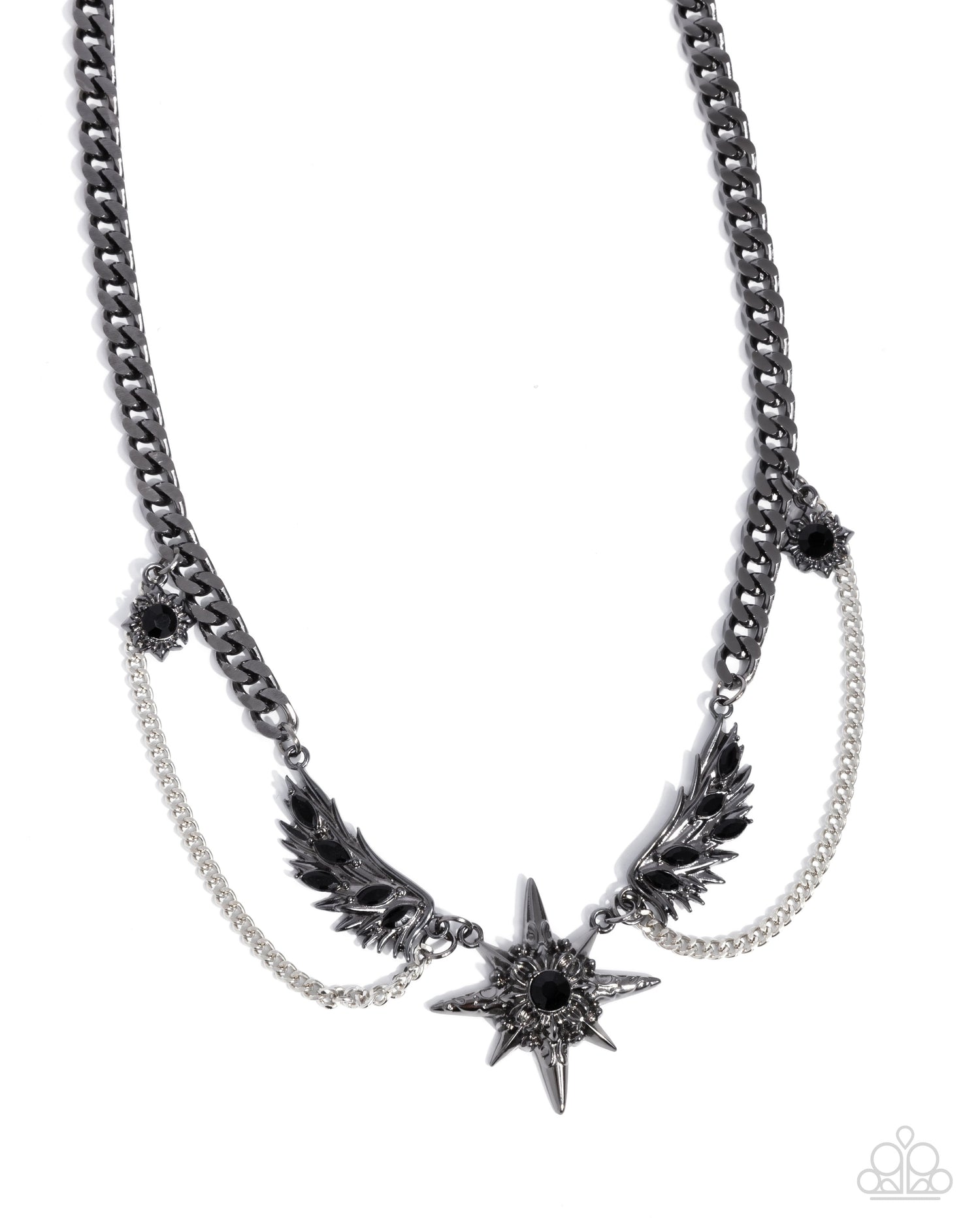 Connected to a gunmetal curb chain, a daintier strand of silver chain cascades below the neckline for an industrial display. Frames of angelic gunmetal wings, dotted with marquise-cut black gems, black gems in floral frames, and a black gem-embellished three-dimensional textured gunmetal star connect along the gunmetal chain for creatively cosmic flair. Features an adjustable clasp closure.