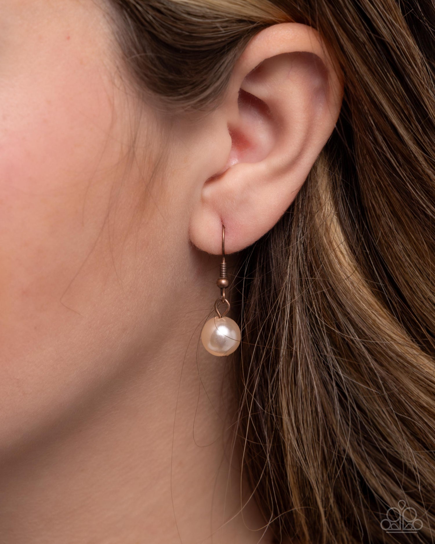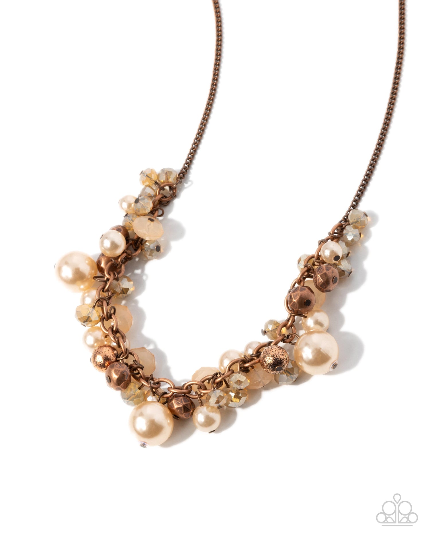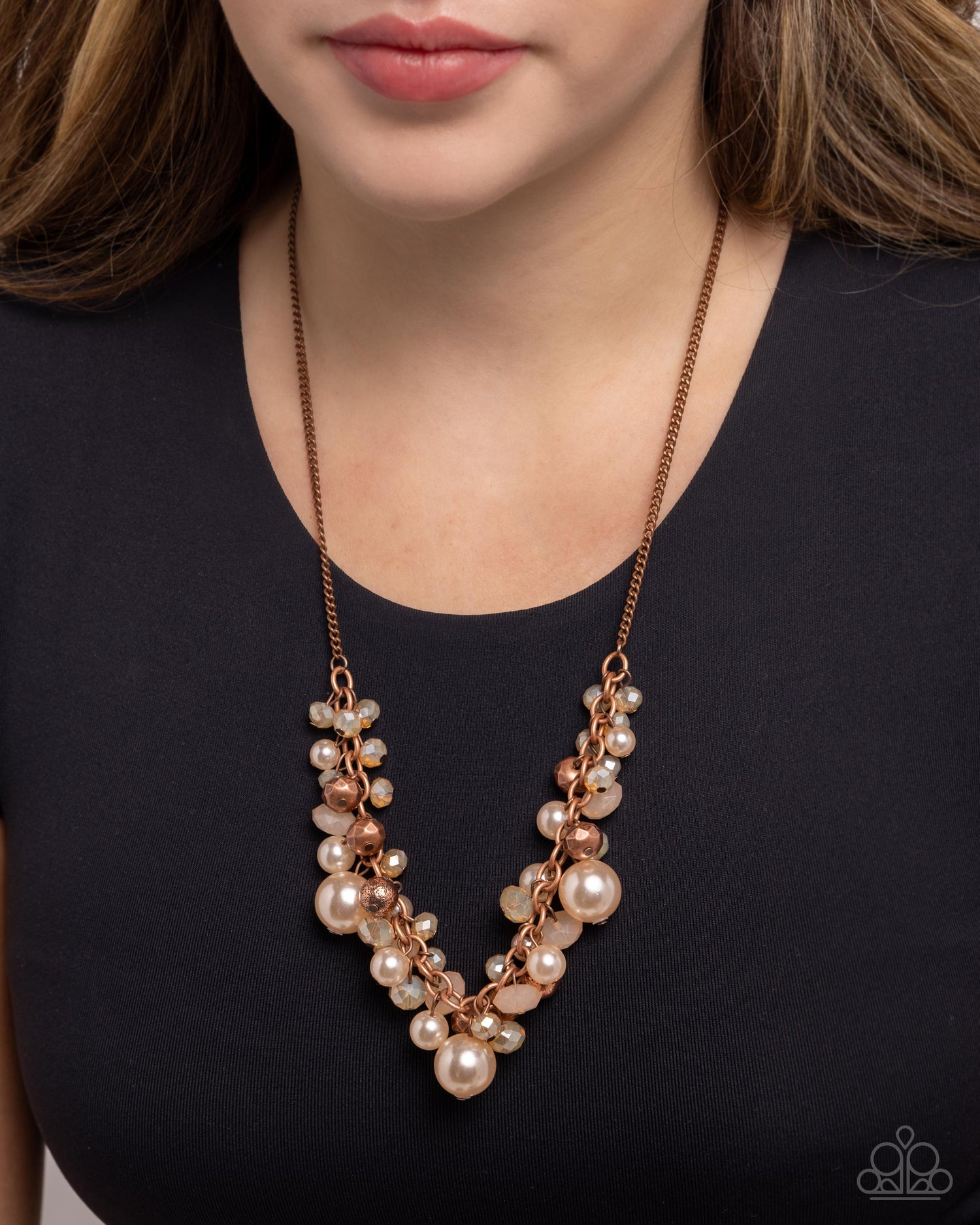 Connecting to a dainty copper chain, a clustered collection of Tender Peach pearls, faceted copper beads, hammered copper beads, milky Tender Peach acrylics, and transparent peachy beads coalesce below the neckline for a dynamic debonair display. Features an adjustable clasp closure.