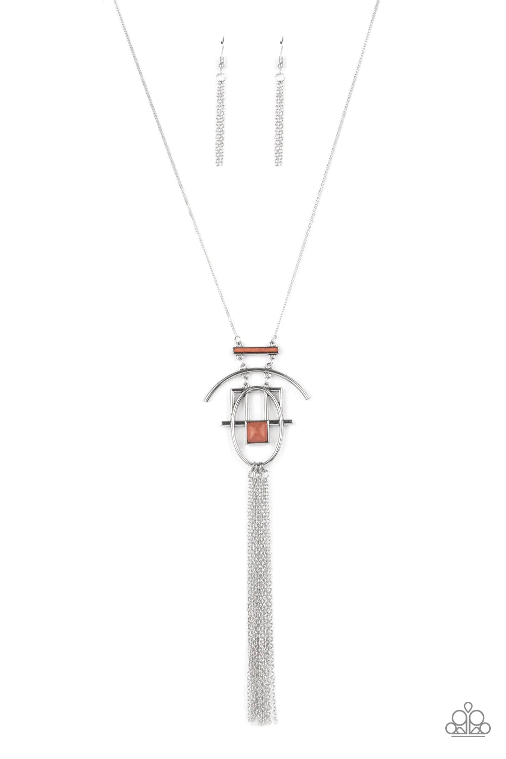Infused with earthy Rust stone accents, shiny silver bars link and connect into stacked geometric frames at the bottom of a lengthened silver chain. A shimmery silver chain tassel streams from the bottom of the stacked pendant, adding a free-spirited finish to the artisan inspired talisman. Features an adjustable clasp closure.