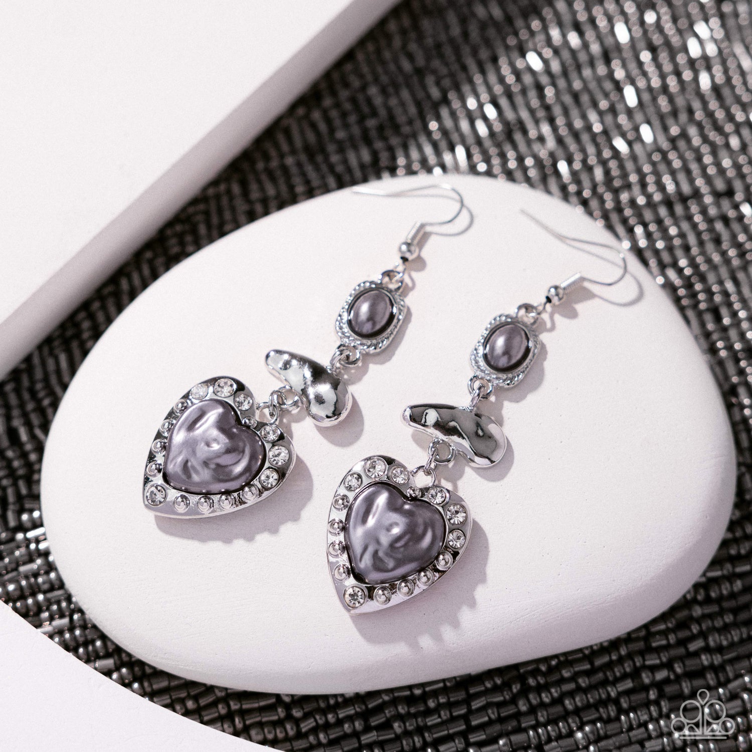 Pressed in a textured silver frame, an oval Gull Gray pearl gives way to a hammered abstract silver bar, which then gives way to an oversized silver heart, adorned with a lustrous baroque Gull Gray pearl center and bordered by dazzling white rhinestones and silver studs, creating a whimsical romantic lure. Earring attaches to a standard fishhook fitting.