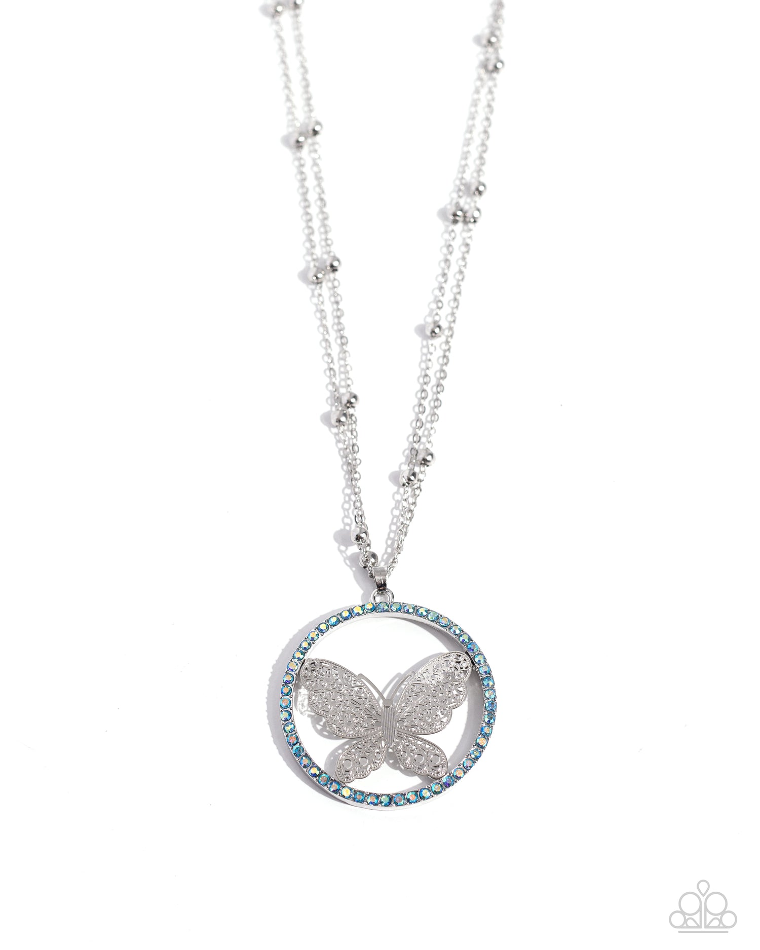 Fluttering along a double-stranded silver satellite chain, a silver filigree butterfly, centered in a blue-iridescent rhinestone border twinkles below the neckline for a whimsical statement. Features an adjustable clasp closure. Due to its prismatic palette, color may vary.
