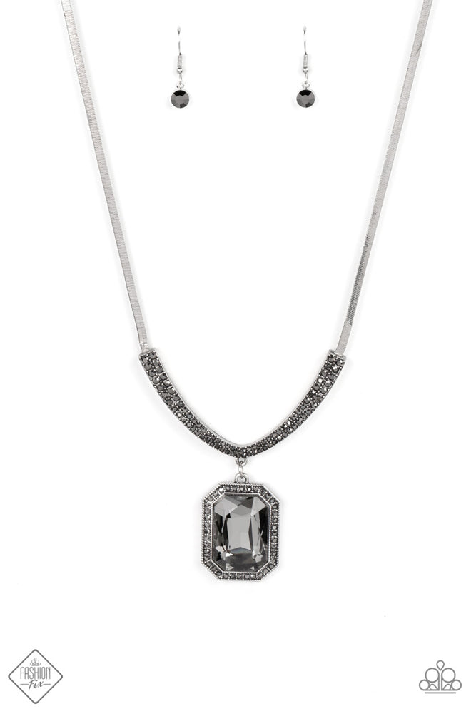 An oversized, smoky, emerald-cut gem is bordered by tiny hematite rhinestones and dizzying studded texture, creating a smoldering pendant that swings from the bottom of a curved bar. Hematite rhinestones lay side-by-side along the curved bar of silver, graduating in size as they climb the neckline and connect to a flat silver snake chain in a sleek finish. Features an adjustable clasp closure.
