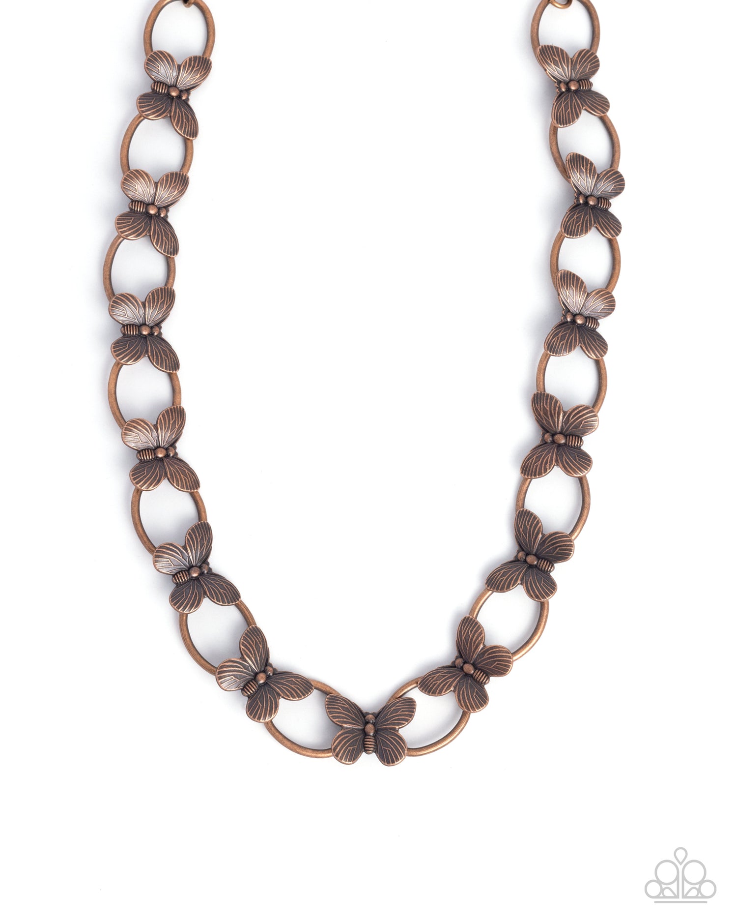 Featuring glistening texture, a kaleidoscope of copper butterflies flutter in between oval sleek copper rings for a wildly whimsical display around the neckline. Features an adjustable clasp closure.