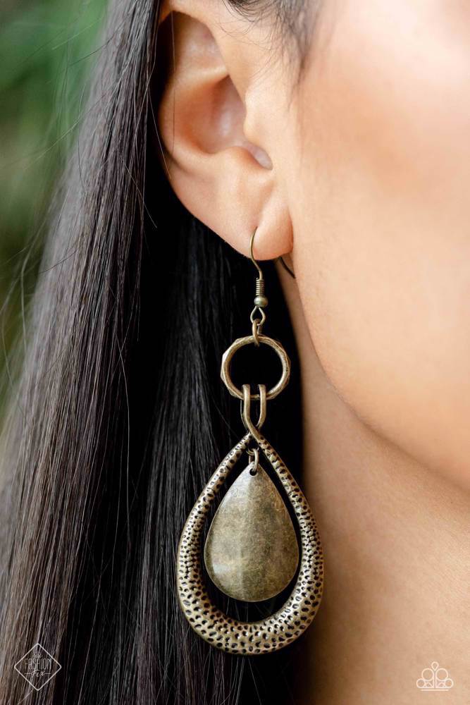 A gritty brass teardrop is suspended from the top of a textured brass frame, creating a bold statement piece. The surprisingly lightweight frames are affixed to a textured ring of brass, ensuring effortless and airy movement as the design swings from the ear. Earring attaches to a standard fishhook fitting.