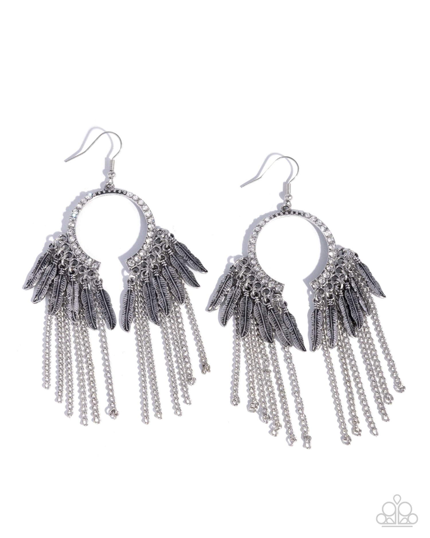 An open-ended circle features a ring of white rhinestones and antiqued silver studs as it sways from the ear. A cascade of textured silver feather charms and glistening chain fringe fans out below, creating a dynamic and eye-catching look. Earring attaches to a standard fishhook fitting.