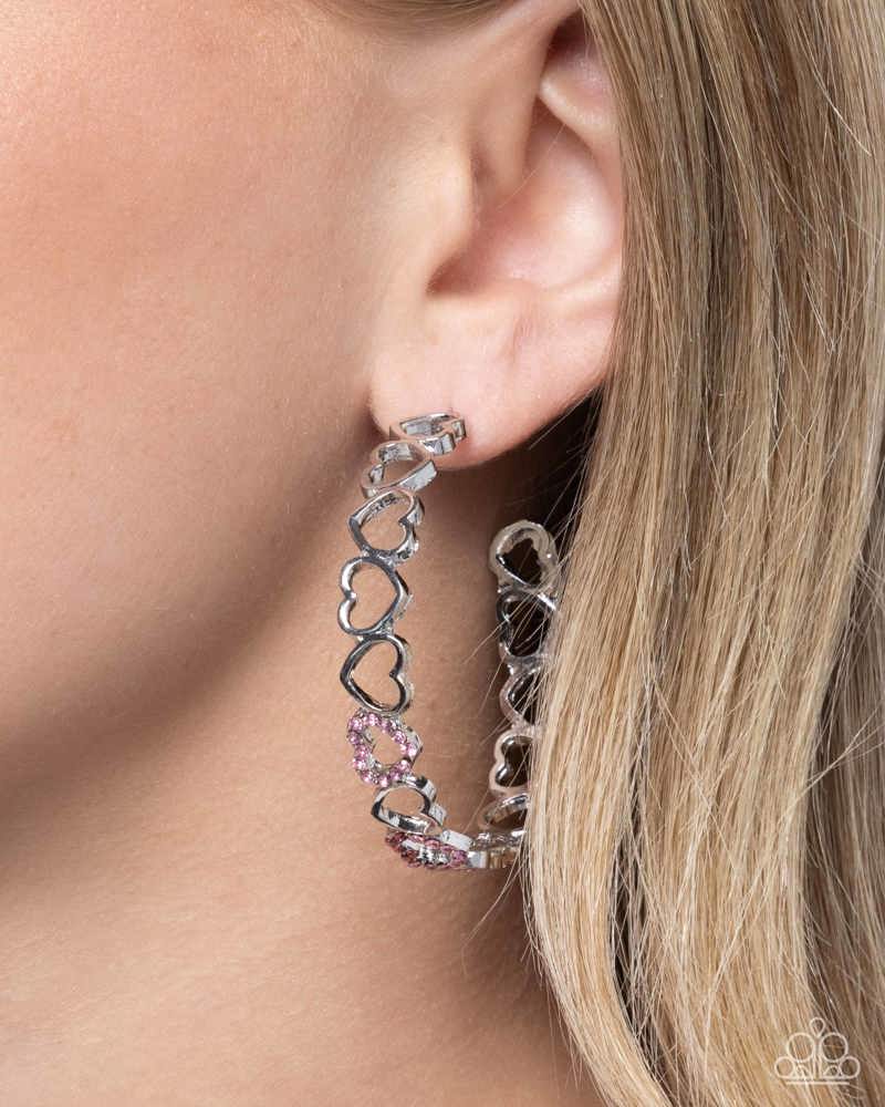 A collection of silver heart silhouettes, some embellished in pink rhinestones, alternate in direction along the ear for a shimmery sweet look. Earring attaches to a standard post fitting. Hoop measures approximately 2" in diameter.