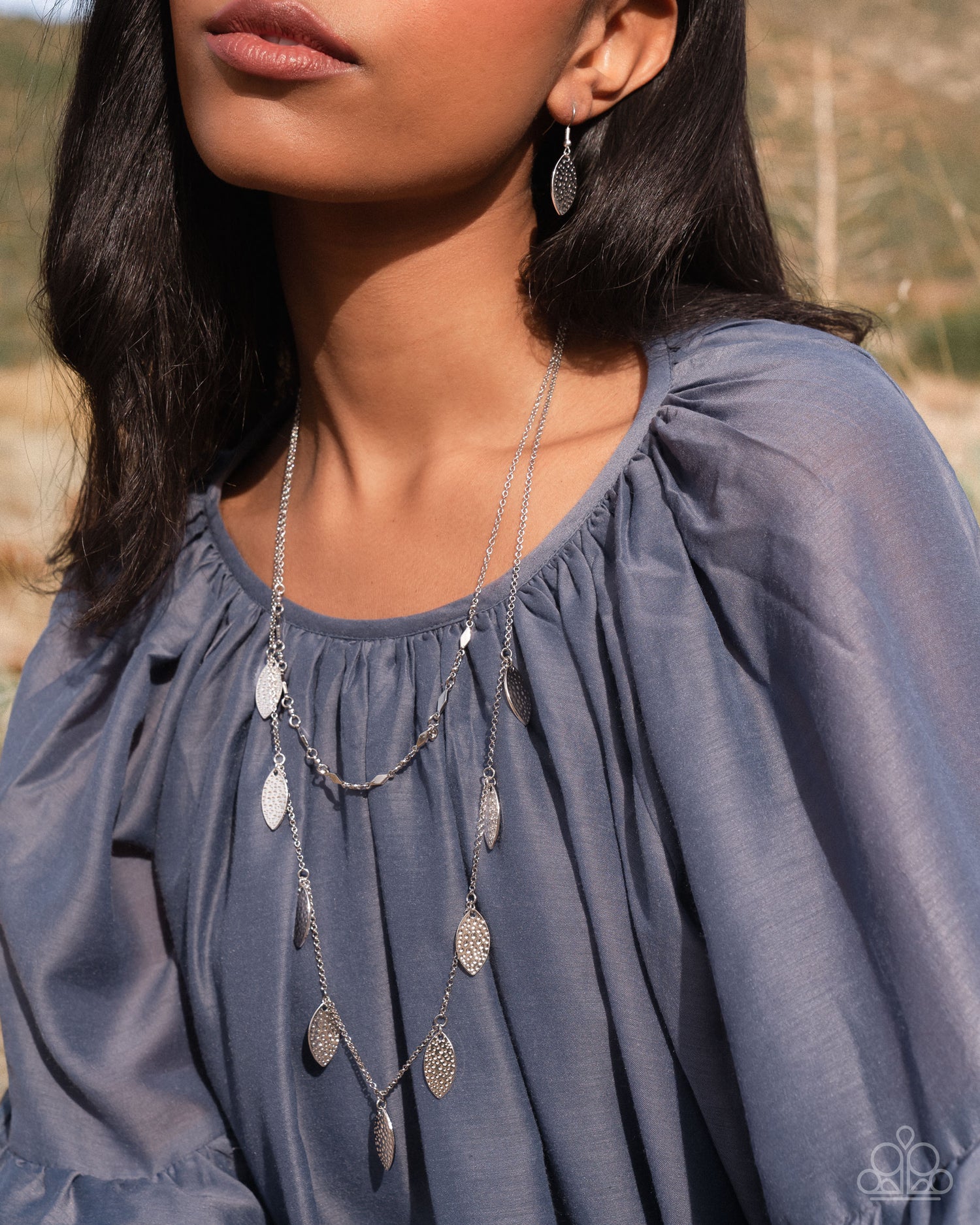 Hammered with a dotted motif, dainty silver leaf frames swing from the bottom of a glistening silver chain below a diamond-cut textured silver chain, creating a whimsical layered fringe. Features an adjustable clasp closure