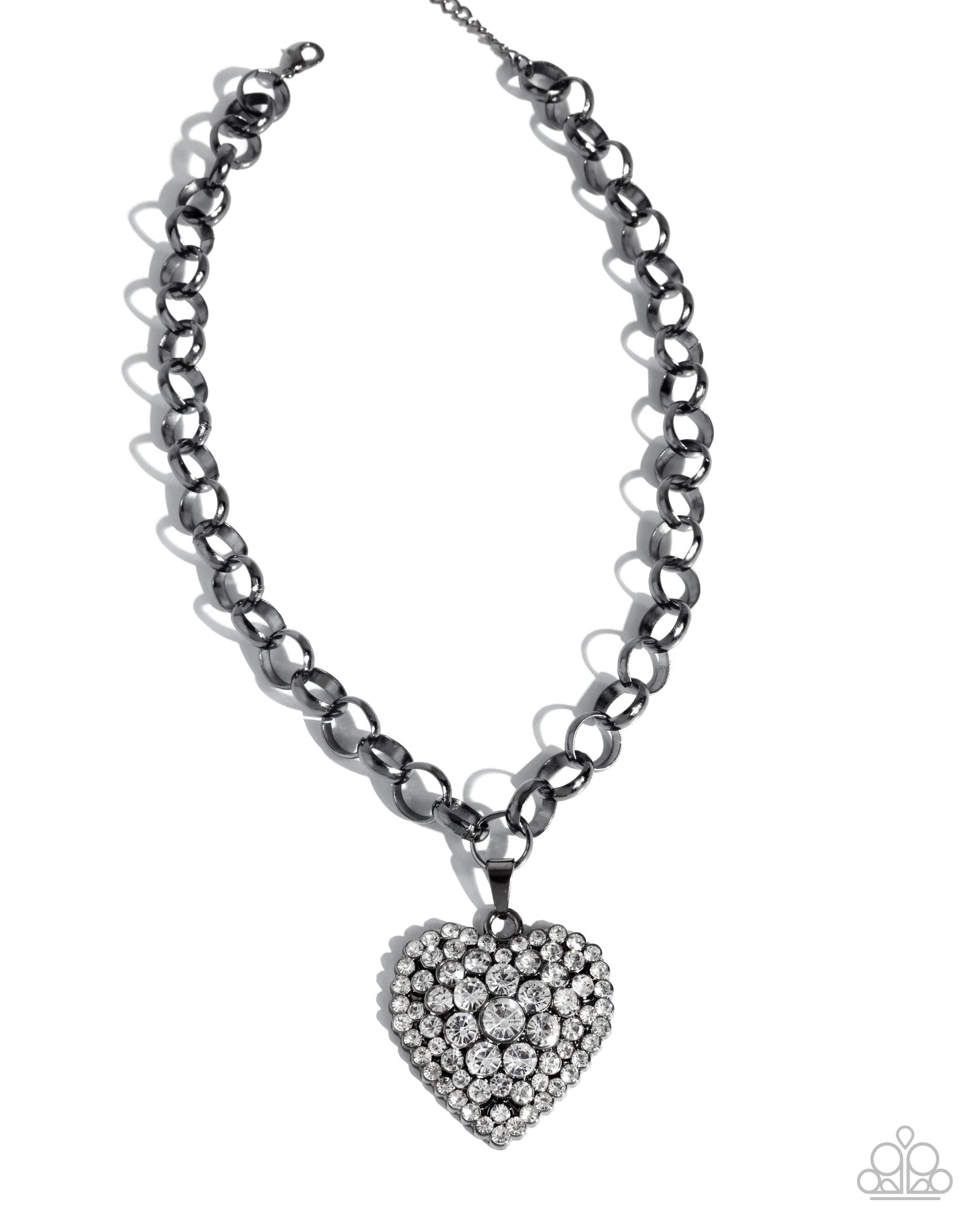 A cluster of dazzling white rhinestones creates a glamorous heart-shaped pendant that swings from oversized gunmetal links, creating a bold and radiant design. The brilliant white rhinestones gradually increase in size as they reach the center. Features an adjustable clasp closure.