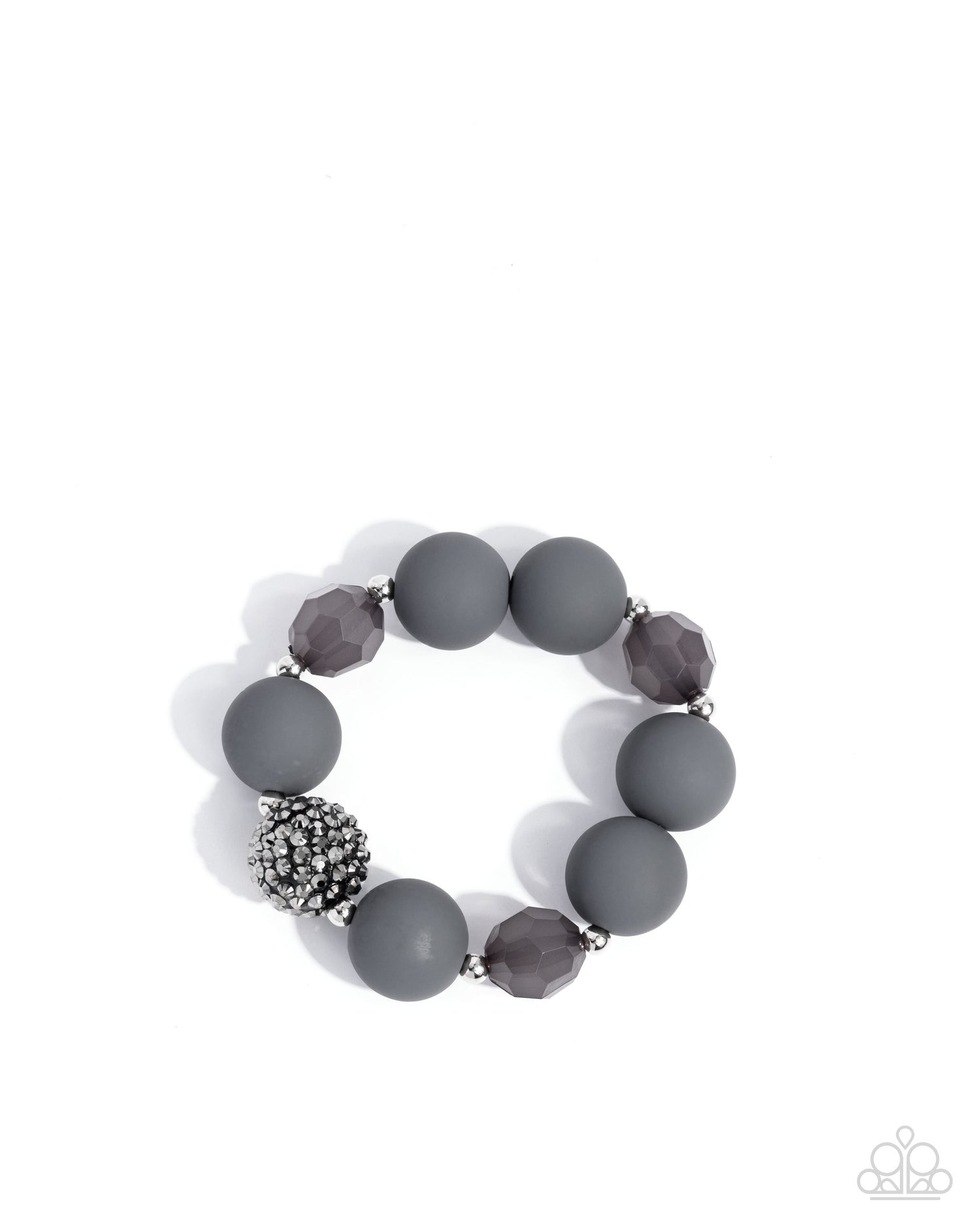 Featuring stretchy bands around the wrist, large matte gray beads and faceted smoky gray accents are punctuated by a sparkling hematite-encrusted bead, adding a dash of elegance to the modern design.