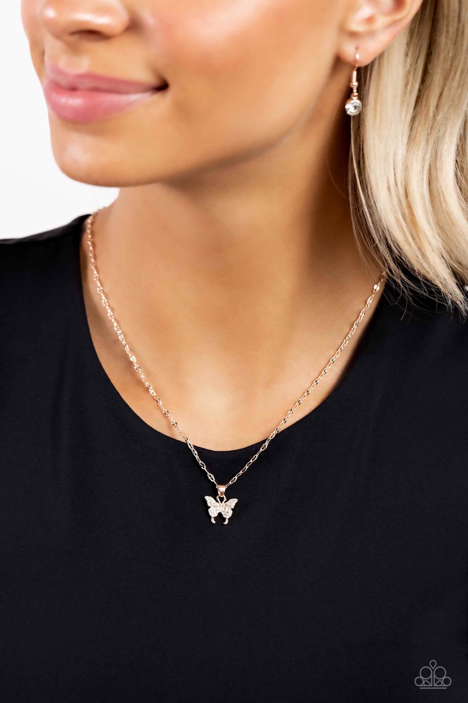 A dainty white rhinestone-encrusted butterfly in a high-sheen rose gold finish elegantly slides along a rose gold chain for a whimsical finish. Features an adjustable clasp closure.
