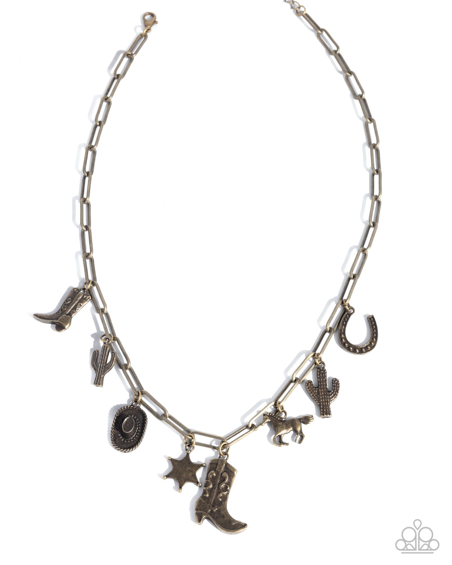 A brass chain necklace features an array of Western-inspired charms, including cowboy boots, cacti, a cowboy hat, a brass horse, a sheriff's badge, and a studded horseshoe, adding a playful, country-themed vibe. The charms are suspended along a rustic brass chain for a dynamic and textured look. Features an adjustable clasp closure.