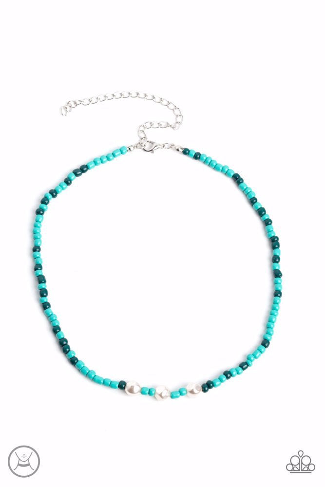 Stretched along an invisible wire, a collection of green seed beads in various shades, circles above the collar for a vibrant pop of color. Three baroque pearls interrupt the beading, adding a refined sheen to the design. Features an adjustable clasp closure.