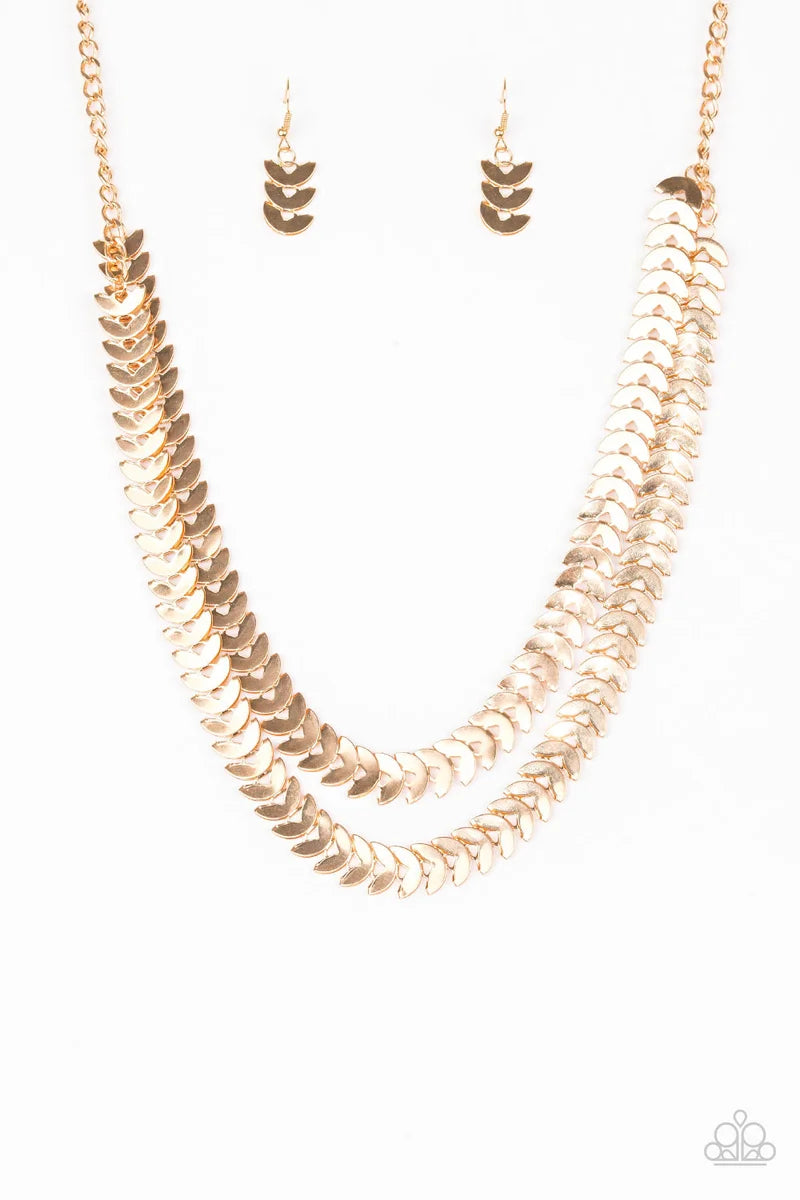 Glistening gold discs are folded in half and linked into two shimmery layers across the chest for an edgy industrial look. Features an adjustable clasp closure.