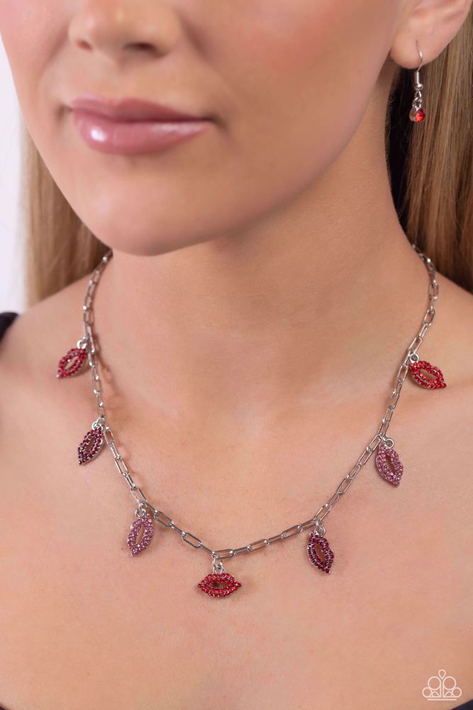 Set along a silver paperclip chain, a pouty collection of lip charms, each embossed in red, dark red, and pink rhinestones alternates below the collar for a love-struck fashion. Features an adjustable clasp closure.