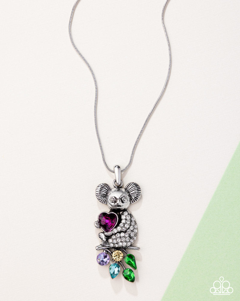 Curling around a fuchsia gem heart, a textured white rhinestone-dusted silver koala perches atop a silver branch that gives way to a collection of Grass Green teardrop gems, a blue teardrop gem, a round purple gem, and a yellow round gem, gliding along a silver snake chain for an adorably Australian-inspired look below the neckline. Features an adjustable clasp closure.