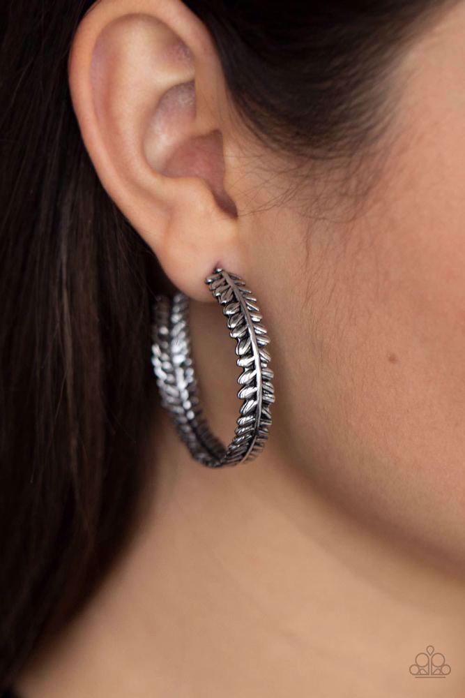 Brushed in an antiqued shimmer, a leafy silver frame delicately curls into a whimsical hoop. Earring attaches to a standard post fitting. Hoop measures approximately 1 1/4" in diameter.