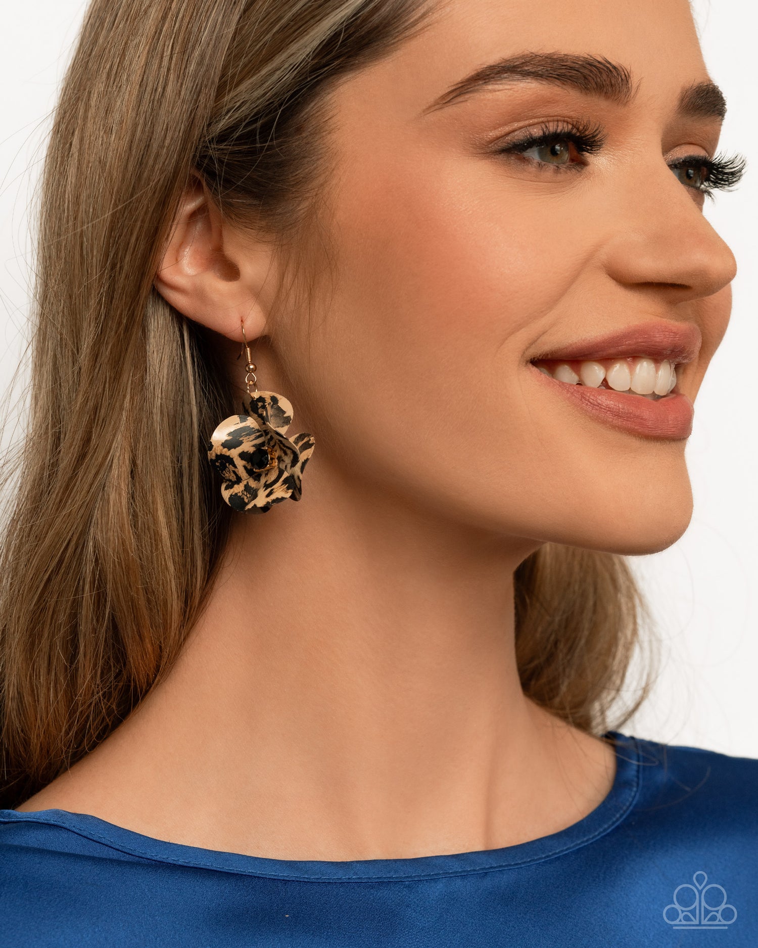 A trio of layered, leopard-printed petals blooms into a bold floral design. A black rhinestone adorns the center, adding a pop of sparkle to the wild pattern. Earring attaches to a standard fishhook fitting.
