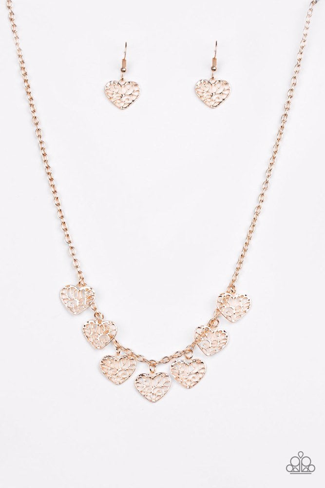 Infused with vine-like filigree filled centers, dainty rose gold hearts swing from the bottom of a shimmery rose gold chain below the collar for a whimsical look. Features an adjustable clasp closure.