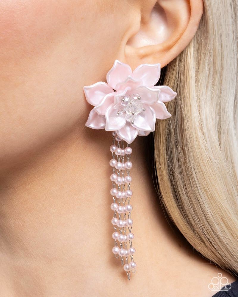 Featuring crystal-like faceted white and silver beaded centers, a collection of baby pink pearlescent petals bloom and expand atop the ear in a three-dimensional display for a lotus-like whimsical centerpiece. Brushed in an iridescent finish, baby pink pearls are infused along a quartet of silver chains, tapering in various lengths below the flower for a polished finish. Earring attaches to a standard post fitting. Due to its prismatic palette, color may vary.