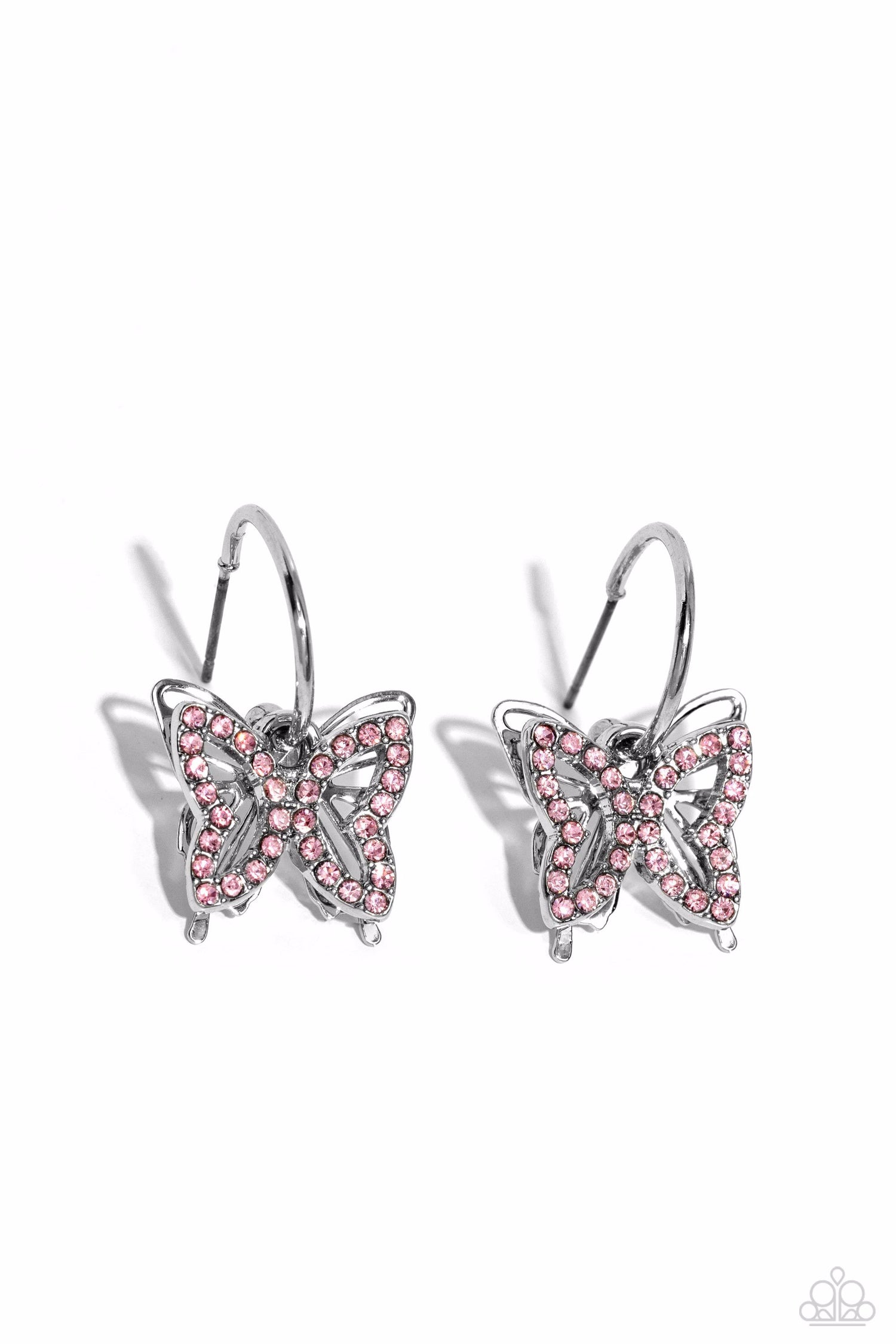 A small, skinny, shiny silver hoop curves around the ear in a timeless fashion. A shiny silver ball is affixed to the end of the hoop, reminiscent of a barbell fitting. A pink rhinestone-encrusted butterfly frame, layered in front of a shiny silver airy butterfly frame, slides along the curvature of the hoop, adding a whimsical hint of shimmery movement. Earring attaches to a standard post fitting. Hoop measures approximately 1/2" in diameter.