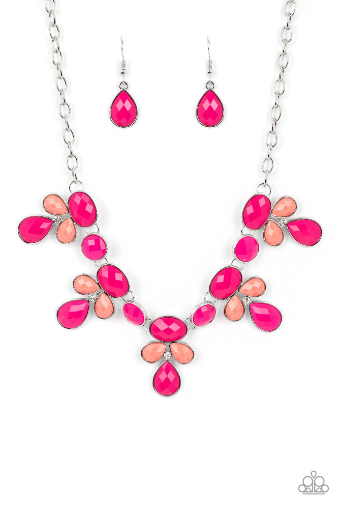 Featuring dizzying faceted finishes, a collection of oval, round, and teardrop shaped beads in vibrant shades of coral and Pink Peacock cluster into colorful frames around dainty white rhinestones. The whimsical frames connect below the collar, resulting in a summery pop of color. Features an adjustable clasp closure.