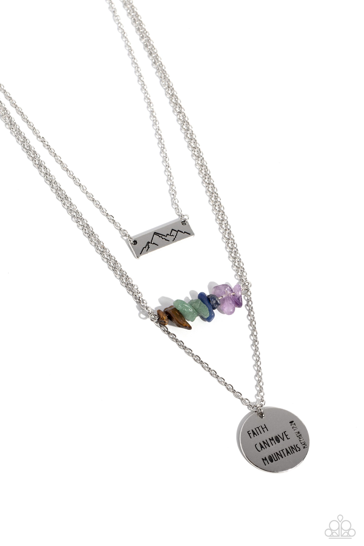 Infused with three earthy pendants, three shimmery silver chains layer across the chest. A silver rectangular plate, stamped with a mountain outline swings from the uppermost chain above a row of chiseled tiger's eye, jade, lapis, and amethyst stones. An oversized shimmery silver disc stamped with the phrase "Faith can move mountains" with the scripture reference "Matthew 17:20" listed to the side of the disc hangs from the lowermost chain for a wanderlust vibe. As the stone elements in this piece are natural, some color variation is normal.