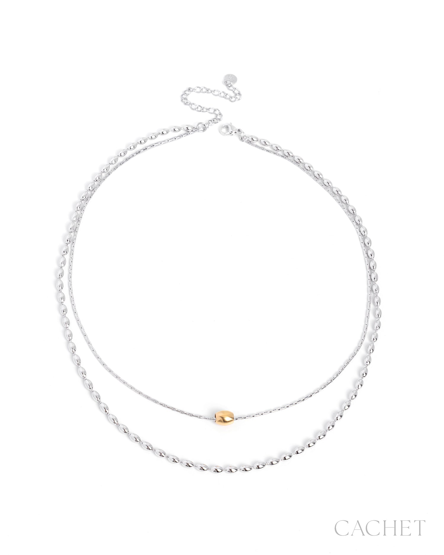 Like a woven wonder, the necklace âMirelâ layers mismatched silver and gold accents and chains in effortless harmony, each tone reflecting the other in a luminous balance of admiration and grace.