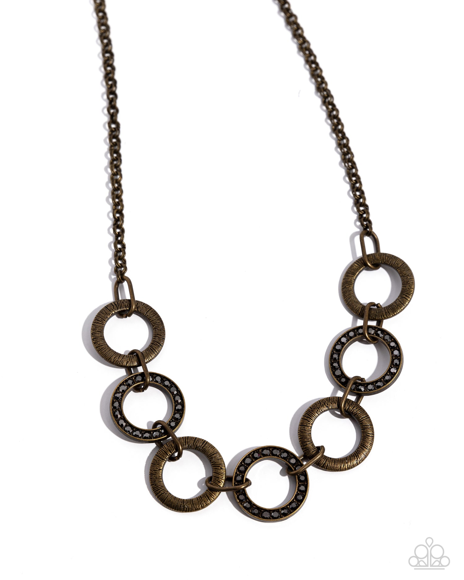 Textured brass hoops and glittery hematite rhinestone encrusted hoops link below the collar for a sassy industrial look. Features an adjustable clasp closure.