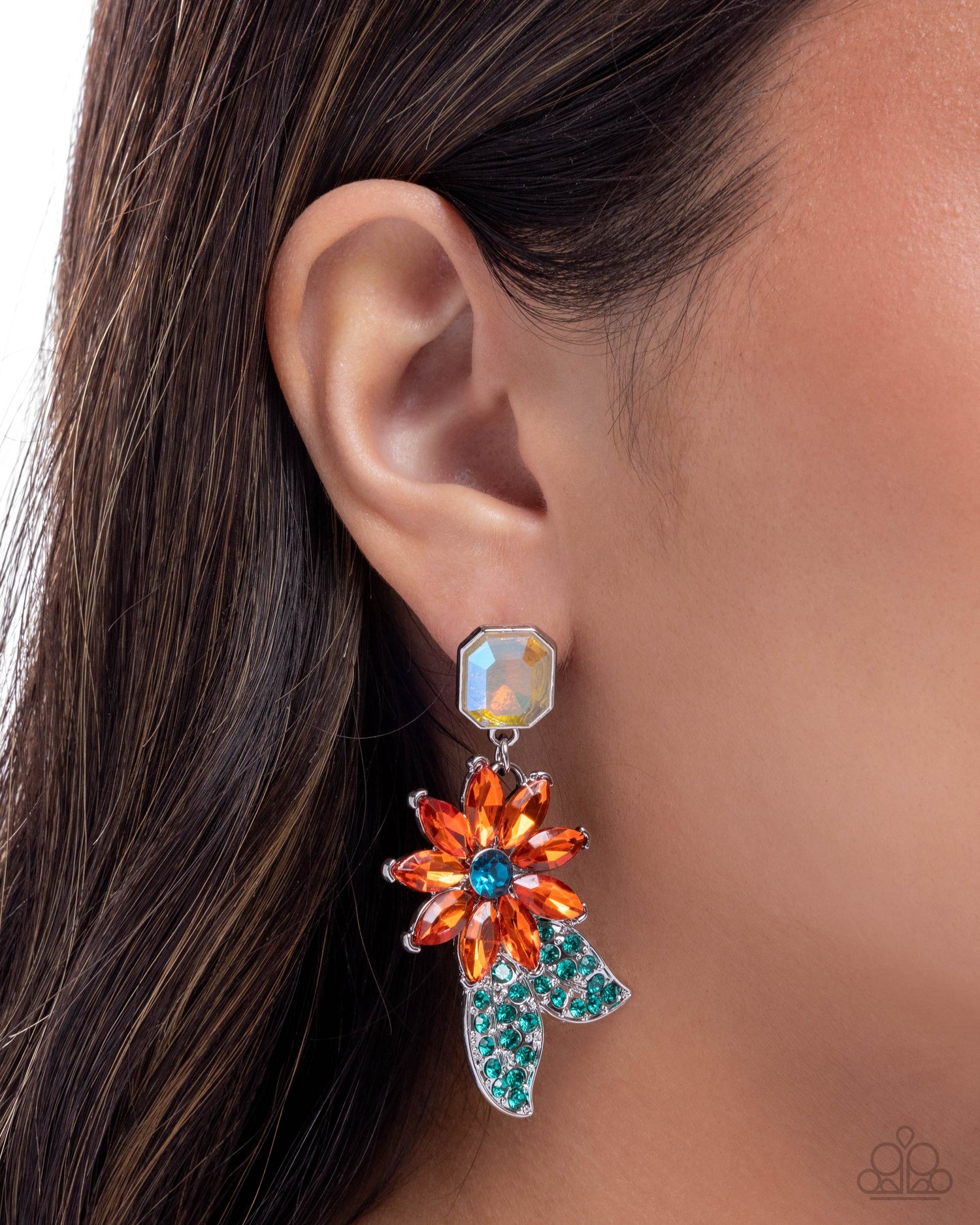 Pressed in a silver fitting, an orange UV-shimmery emerald-cut gem glistens from the ear, giving way to an aquamarine rhinestone-centered orange marquise-cut flower for a whimsical pop of color. Emerald rhinestone-dotted silver leaves flair out from the silver-pronged floral centerpiece for a finishing touch of shimmer. Earring attaches to a standard post fitting.