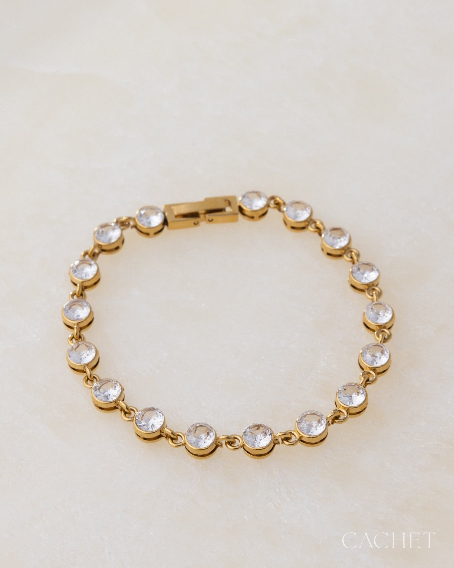 Premium Stainless Steel Base and 18K Gold PVD Plating. Chain measures approximately 7" in length. Features a fold-over clasp closure. Features cubic zirconia.