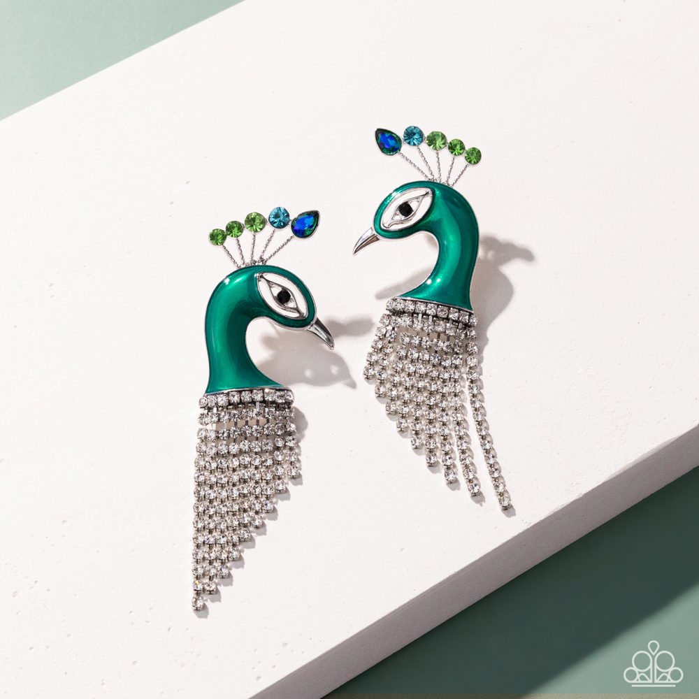 Dotted with a collection of blue and green multicolored and UV shimmery teardrop and round gems, a silver-studded crest shimmers atop an Aventurine-painted peacock, complete with a black gem eye and sharp silver beak. A tapered fringe of glittery white rhinestones in silver square fittings cascades from the bottom of the peacock head, creating a magically majestic centerpiece atop the ear. Earring attaches to a standard post fitting.