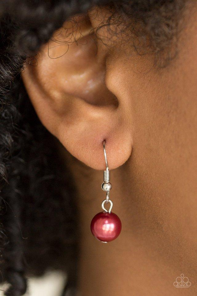 Pearly red beads and shimmery silver hoops trickle along glistening silver chains, creating mismatched layers down the chest. Features an adjustable clasp closure.