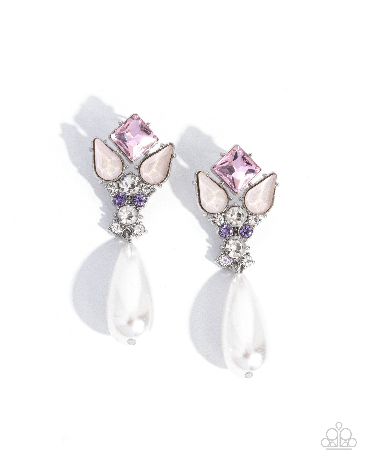 A stunning stack of round, diamond-cut, and teardrop light pink, white, violet, and opalescent pink rhinestones and gems lavishly fans out into a glistening arrangement in silver-pronged fittings below the ear, giving way to an elongated white pearl teardrop for a refined lure. Earring attaches to a standard post fitting.